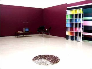 Plus sophistiquées en apparence, les installations de Boy & Erik Stappaerts ont pour matériau et objet, l’espace, et les modalités, d’exposition mêmes. Les murs blancs ont disparu au profit de subtiles harmonies en camaïeu, dont les tonalités sont par ailleurs rangées en dégradé dans des casiers conçus à cet effet. Un poste de consultation sur micro-ordinateur ouvre sur l’espace virtuel d’exposition que propose le site Web de l’artiste. D’un design très années soixante-dix, des objets lisses en plastique moulé, qui évoquent cuve ou centrifugeuse, sont disposés sur une table de formica orange. Dans un coin mi-bureau mi-salon, un poste de télé débite en continu une longue interview en anglais de l’artiste, qui propose ainsi sa redéfinition de l’espace muséal.