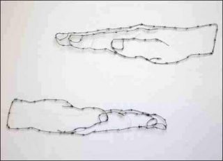 Illustration de l’héritage, les mains de barbelés, réalisées à l’atelier Calder en 2009, convoquent un paradoxe. Celui d’une main dessinée dans un matériau agressif et celui d’une main qui donne et protège. En effet, ces mains n’incarnent-elles pas l’héritage qu’il faut protéger et qu’il faut aussi savoir accepter de recevoir?