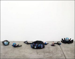 — Annette Messager, L’Ensemble des mondes, 2006. Skaï, caoutchouc, filet, peluche, chaussette, terracotta et bois peints. 150 x 125 x 20 cm