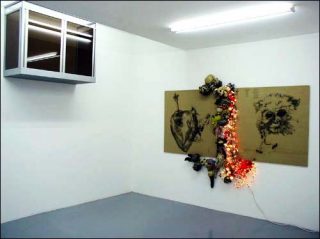 — L’Invention du caducée, Vous qui ne m’appelez plus Dorothy, 2008. Crânes, coeur en verre, coeur en plastique, un godemichet, un cran d’arrêt, bijoux, 20 guirlandes lumineuses, deux transferts de dessin sur médium rehaussés de crayons de couleur, deux pâtes de sanglier, des cornes, un cockering. 150 x 230 cm.