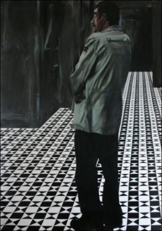 Dans un autre tableau, quelques couvertures pendent très simplement sur des tréteaux, tandis que le sol de graviers révèle une facture plus que réaliste. Dans ces nouvelles oeuvres, les sols apparaissent comme une métaphore de la vie intérieure des modèles. À plusieurs reprises, lʼartiste fait évoluer ses figures sur des pavements géométriques qui évoquent tout à la fois la Renaissance italienne et lʼOp Art. La perspective quʼinduit la géométrie bichromique agit ici comme un contrepoint rassurant aux zones picturales plus libres. Elle forme un socle de rationalité, mais on pressent toutefois que son équilibre est fragile. En effet, on imagine aisément que le sol pourrait brusquement sʼouvrir, et engloutir ces personnages en proie au doute, qui tentent de résister à la violence de lʼépoque en puisant en eux une force intérieure salvatrice.