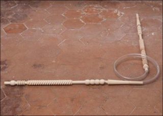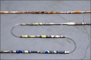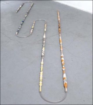 — Marlie Mul, Me (connected), 2010. Bois tourné, encres acrylique, vernis, tubes en plastique. Approx. 370 x 115 cm