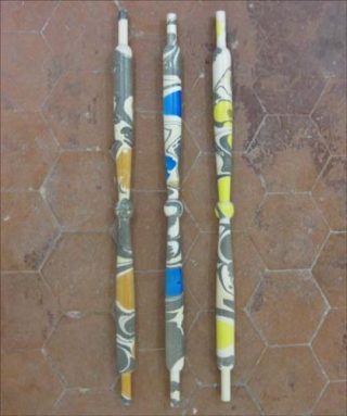 — Marlie Mul, Sticks (Blue, Yellow, Terracotta), 2010. Bois tourné, encres acrylique, vernis. 82 x 4 cm