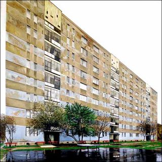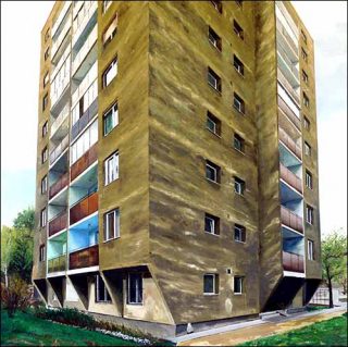 La série des huiles sur toile d’Yves Bélorgey représente des bâtiments réalisés dans les banlieues de Londres par des architectes célèbres (Alison et Peter Smithson, Alan Forsyth et Gordon Benson, etc.). De grand format, ces toiles au rendu lisse et aux couleurs pastelles mais vives sont empreintes d’utopie. Pourtant, et l’actualité sociale l’atteste, les projets sociaux associés à ces architectures n’ont pas toujours abouti aux résultats escomptés.