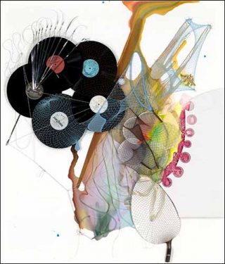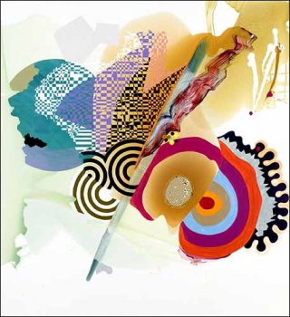 La peinture est mise à l’épreuve, aux limites de la figuration, puisque les seules figures identifiables ne sont pas du fait de l’artiste mais empruntées aux objets du quotidien insérés dans les œuvres sans modification majeure.