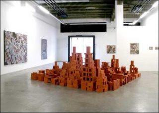 Patrice Mortier peint des tableaux à partir de projections d’images captées sur le net. Il passe pour être l’un des précurseurs de la peinture à partir d’images numériques. Dans cette exposition sont aussi présentées des installations en briques de maçonnerie ou conçues avec d’autres matériaux.