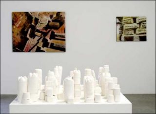 Mais le lien ne s’arrête pas là . La tension des bouleversements de la cité conduisent Patrice Mortier à sortir du tableau pour se diriger vers la sculpture, et vers les préoccupations de la société, notamment au moyen de l’installation constituée à partir de bouteilles d’eau ou de briques tétra-pack, disposées sur un socle, le tout peint en blanc. L’Å“uvre évoque une cité du type de celles qui fleurissent sur les côtes de la Méditerranée.