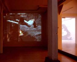 C’est encore plus vrai pour une pièce plus récente comme Oh Mein Papa (2001). Cette projection vidéo de cinq minutes sur mur, s’accompagne, suivant l’espace disponible, de plusieurs moniteurs disposées dans la pièce, à même le sol. Le scénario est le suivant, un tractopelle enlève dans ses mâchoires d’acier une jeune fille — notre artiste — sur un fond digitalisé. Le passage entre le grand format mural et les petits écrans des téléviseurs se fait librement. Pareils à des esquisses, les écrans, par leur dimension réduite, sont des  » études  » du tableau final projeté. Récit central et histoires périphériques permettent l’élaboration d’un va et vient propice à la construction d’une séquence personnelle pour le spectateur.
