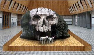 Dans la Verrière – ancienne salle des enchères transformée en serre et sous le coffrage en bois créé par l’architecte Patrick Bouchain – une île a poussé. Sur cette île inspirée par L’Ile des Morts d’Arnold Böcklin vivent des moutons. Le rocher sur l’île ressemble à un crâne géant, les moutons ne savent pas qu’ils vivent dans un crâne. Cette image romantique cache une réalité terrifiante: ces animaux sont en sursis, et vivent là , dans cette image paradisiaque, leurs derniers mois de vie, condamnés par leur naissance aux abattoirs