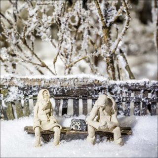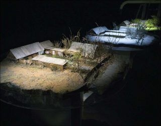 Un dispositif immersif constitue cette performance théâtrale multimédia. Déployé dans un espace isolé d’une blancheur extrême, il nous fait entrer d’emblée dans un no man’s land semblable à celui qu’ont choisi d’habiter les deux protagonistes de la vidéo projetée. Images documentaires et images filmées en direct sont diffusées de façon bi-frontale : à la fois sur un vaste écran central de six mètres de largeur et de chaque côté, par le biais de deux caméras miniature. Trois maquettes giratoires reproduisent l’environnement du couple à trois saisons différentes. Ces modèles réduits de leur modeste habitation en bois, transportée au fil des saisons, deviennent le théâtre de petits événements mis en scène par des moyens mécaniques et filmiques.